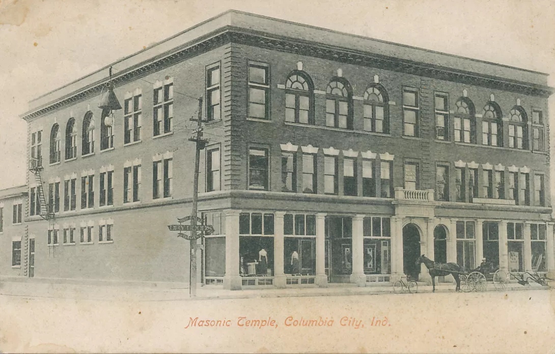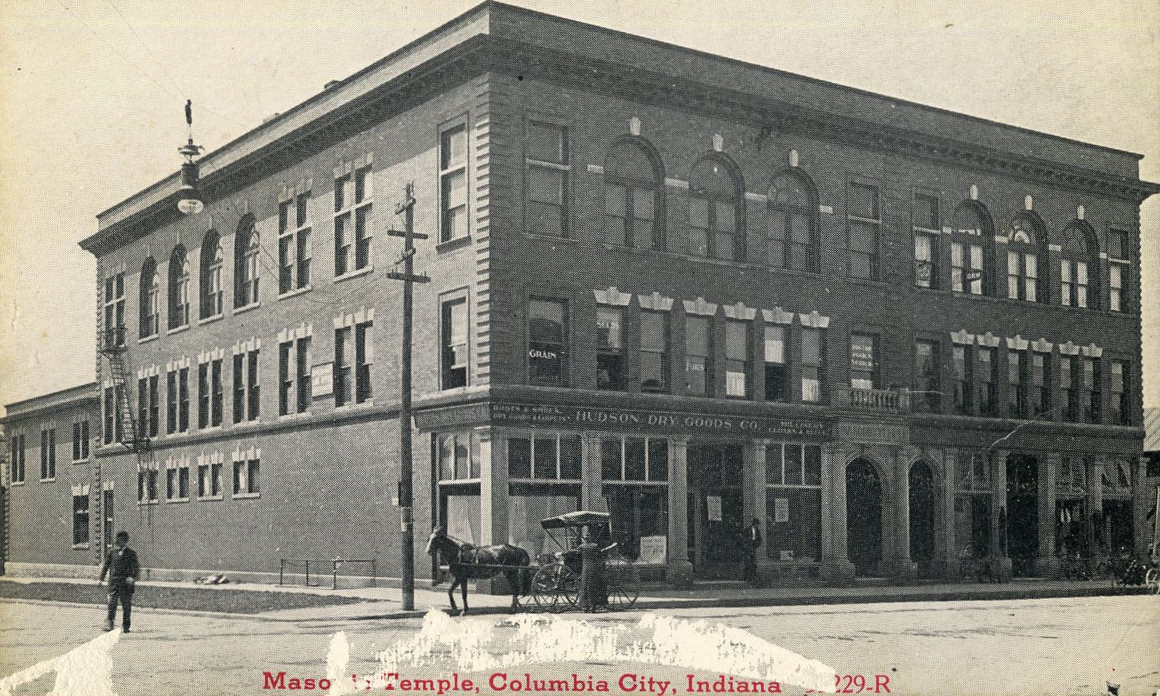 Records of the Masonic Fraternity in Whitley County go back to 1856, and began in the back of Reider’s Grocery store in Columbia City. Newspapers give account that the lodge was instituted with 11 charter members, and among them were James Briggs, William Larwill, John B. Firestone, James B. Edwards, P.W. Hardesty, C.H. Pond, Peter Simonson, H. Rankin, J.W. Bradshaw and Henry Duffin. A plaque affixed to the Raupfer Building makes note of this occasion and it being the original meeting place for this organization.