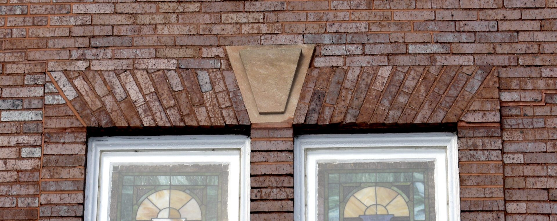 In this case, the bricks across the top of the windows form a jacked arch, in which the bricks are slanted each way away from the keystone, while the bottom of the arch remains flat. However, flat arches with straight (“soldier”) bricks without keystones are also common, although they are often not noticed as a type of arch. The use of a jacked arch and keystone on this church adds aesthetic interest to the façade as well as being an integral structural component.