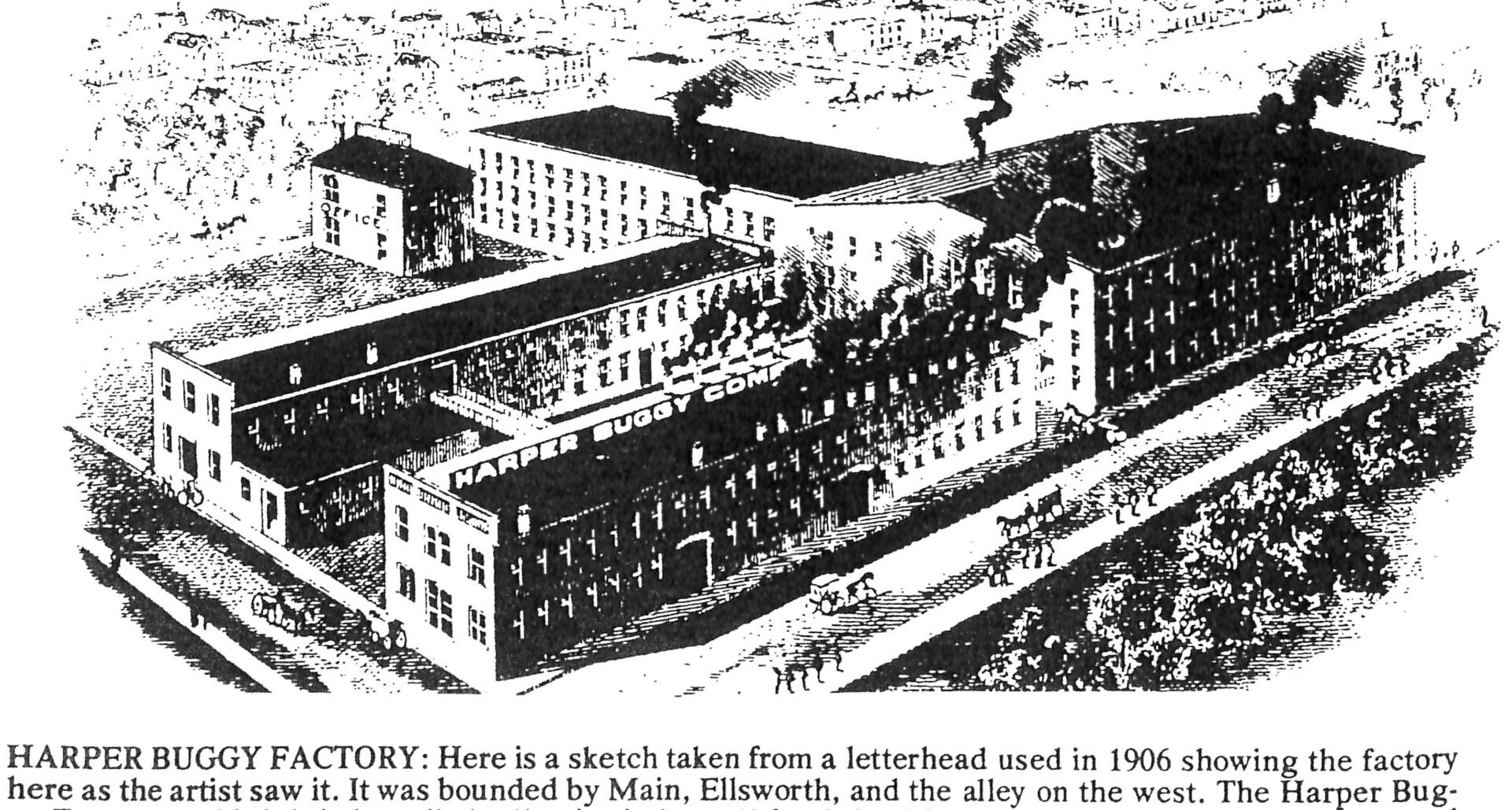 Then came the fateful day in March 1921. The Harper Buggy Co., manufacturers of Buggies, Surreys, Etc. was established in 1881. The factory was bounded by Main and Ellsworth streets, with its primary office and other addresses noted from Ellsworth Street itself. It would be safe to call this a place of “major industry” for its time.