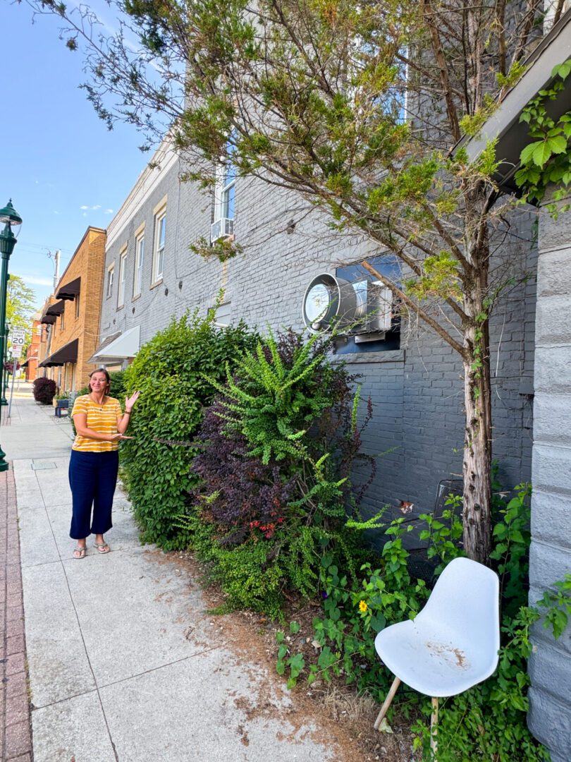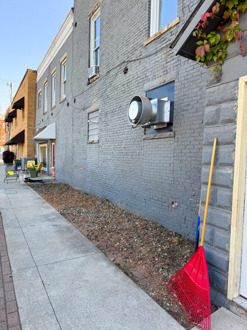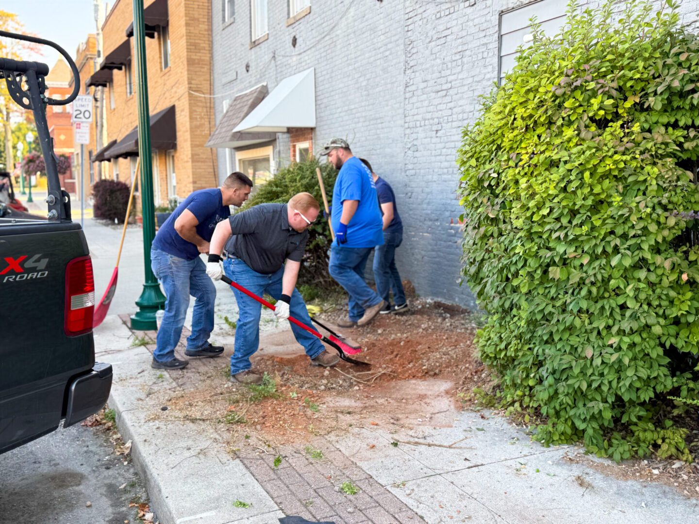The volunteer team took on two large projects that made a noticeable impact downtown. One of the biggest undertakings was the removal of overgrown brush along the side of the Pickle’s Café building. Volunteers cleared out large bushes, thick brush, and even a small tree — completely transforming the space. What was once cluttered and overgrown is now clean, open and beautifully refreshed.