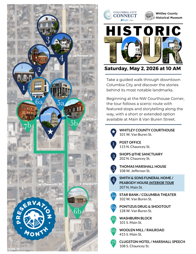 Along the route, guests will hear the dramatic story of the historic shootout at Pontizus Drug–an event that once brought chaos to an otherwise ordinary day in downtown Columbia City. The tour also highlights the legacy of Vice President Thomas R. Marshall, including a stop at his former home and the site of one of his notable speeches, offering insight into one of the community’s most prominent figures. Participants will also have a rare opportunity to tour the Smith & Sons Funeral Home, also known as the Peabody House, for an interior tour that reveals the rich architectural and cultural history of this unique space.